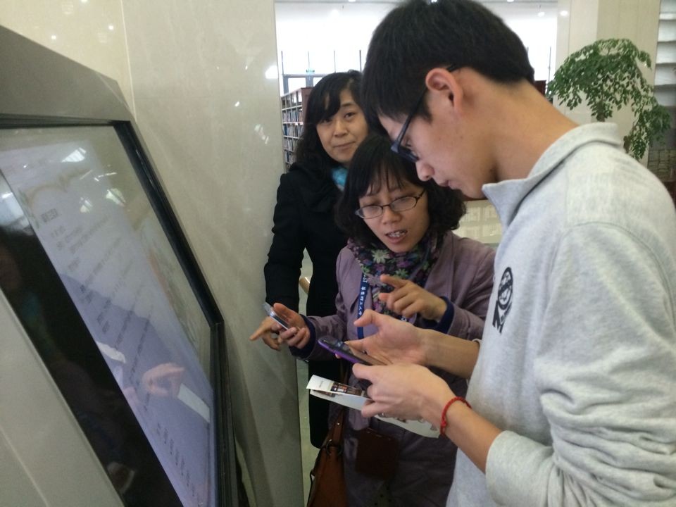 華東理工大學(xué)現場(chǎng),追逐新鮮的年輕讀者紛紛駐足觸摸屏前,拿起手機掃描圖書(shū)館大廳的觸摸屏二維碼進(jìn)行借書(shū)。一位長(cháng)相甜美的女生興奮地跟圖書(shū)館老師說(shuō):“我以前都不知道咱們圖書(shū)館有那么多電子書(shū),我都是在網(wǎng)上找免費下載的txt格式的電子書(shū)看,可費勁兒了。這個(gè)觸摸屏借書(shū)太方便了,《甄嬛傳》、《致青春》、《Gone with the Wind》竟然都有,太激動(dòng)了!”