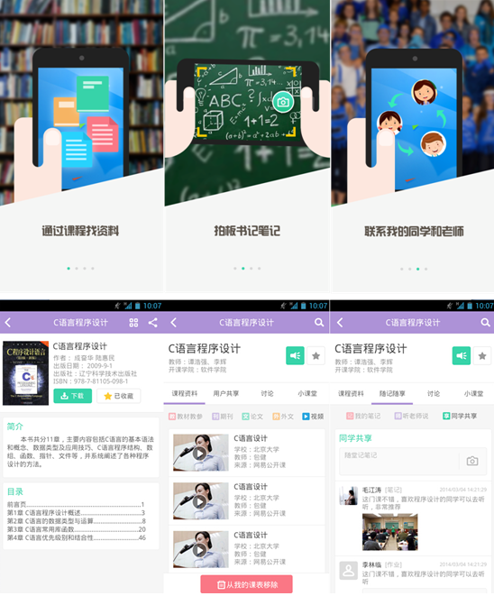 社區空間設計理念:忘掉網(wǎng)盤(pán)、公郵、QQ 群共享,用課程直接分享資料,在這里可以查到以往使用者上傳的文檔;校園云盤(pán)幫助管理課程文檔。教師參與讓平臺更有粘性,指定教材、視頻等各類(lèi)學(xué)習資料,推薦平臺上的好資源,隨時(shí)回答同學(xué)@我的問(wèn)題。